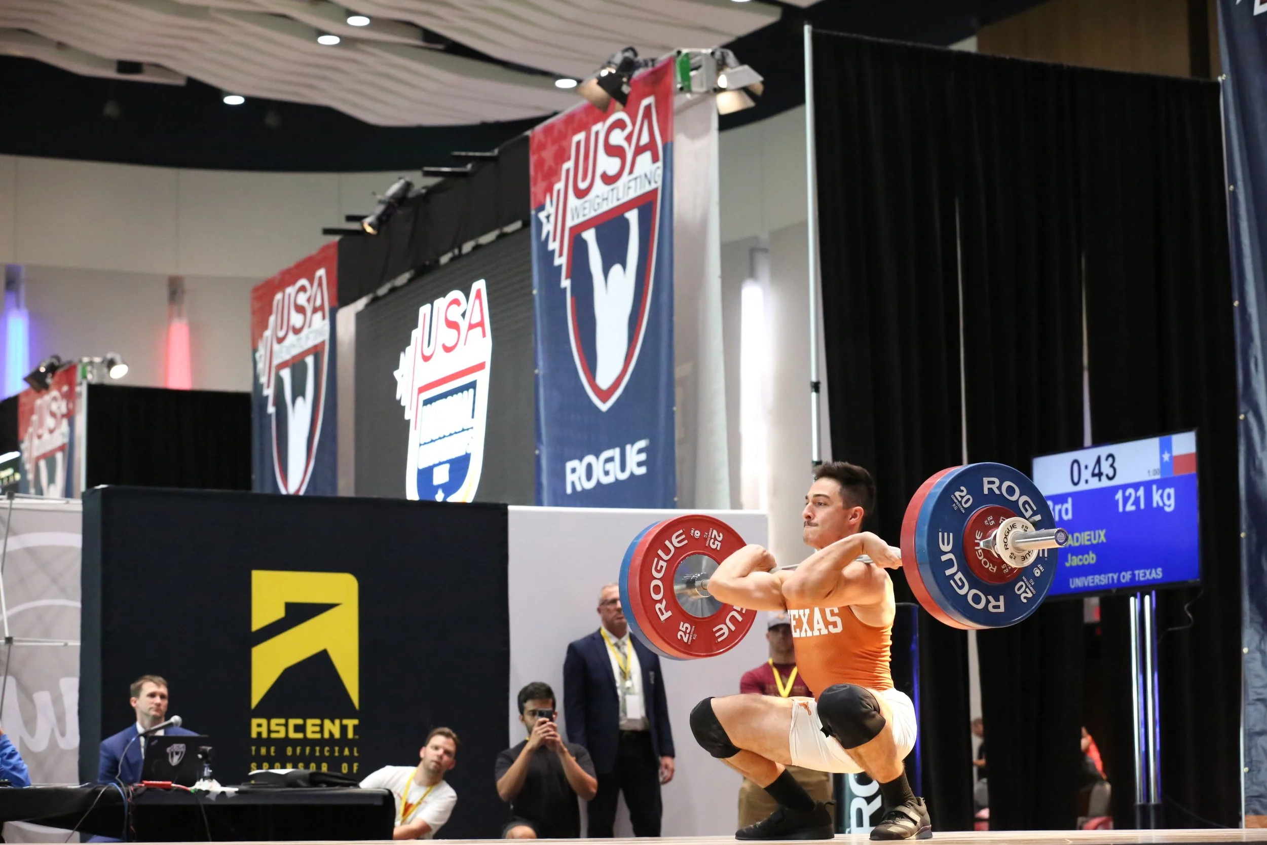 Dillon James, training with Austin Barbell Club in South Austin, started off the second day of competition for the University of Texas Weightlifting Team! Dillon went 2 for 6, going 95/120/215. His 120kg clean & jerk was a competition PR. Gonie Altman was the next Longhorn to lift. She had a huge 6 for 6 performance with all-time PRs in both the snatch and clean & jerk, turning in a 6kg increase in her total from her last competition at University National Championships in March of this year! Gonie went 63/81/144 on the day.